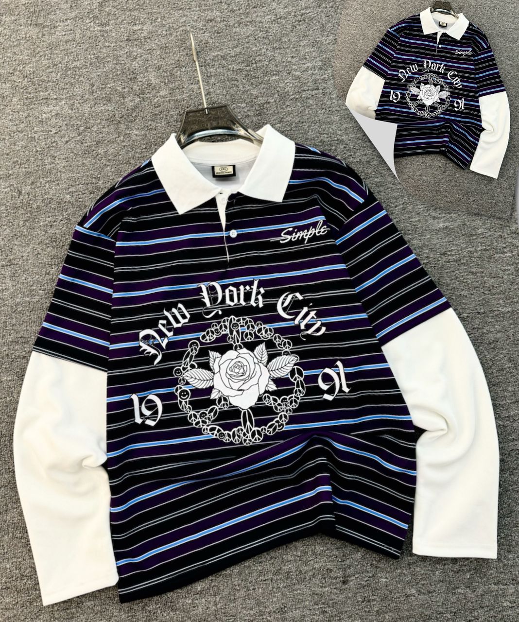 Upgrade your wardrobe with the New York Crest Layered Polo — a bold fusion of vintage street style and modern fashion. Designed with rich burgundy and black stripes, this standout piece features a unique layered look with long white inner sleeves, giving it a stylish, ready-to-wear stacked effect.