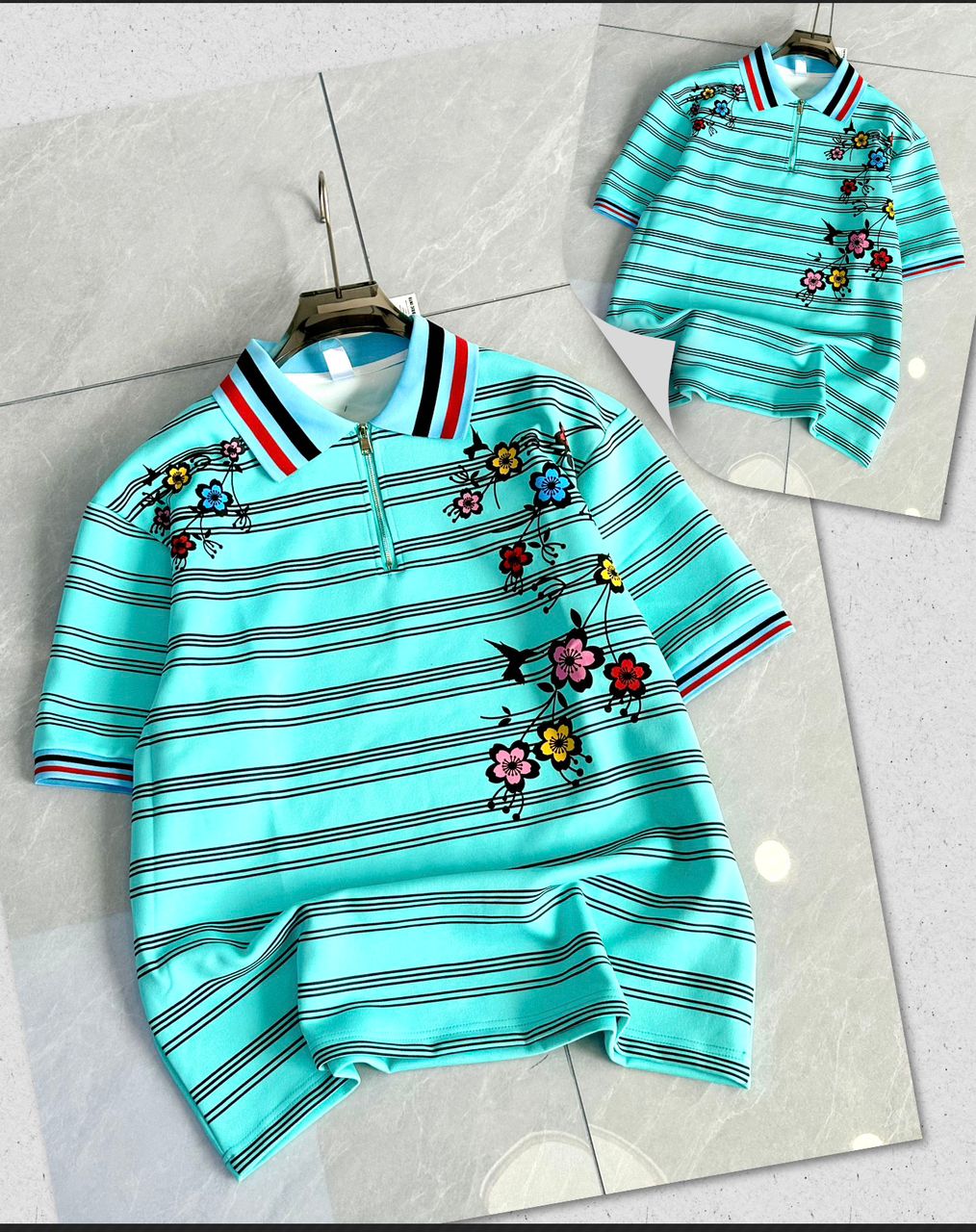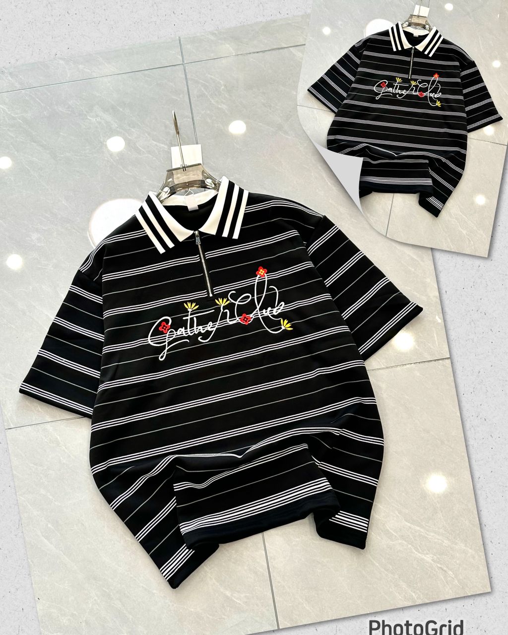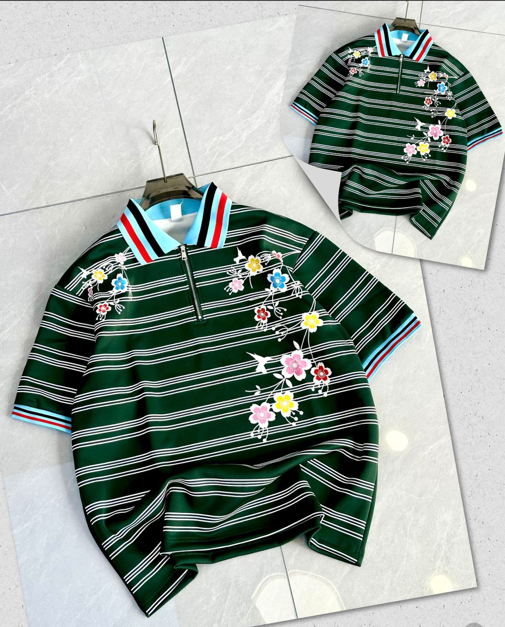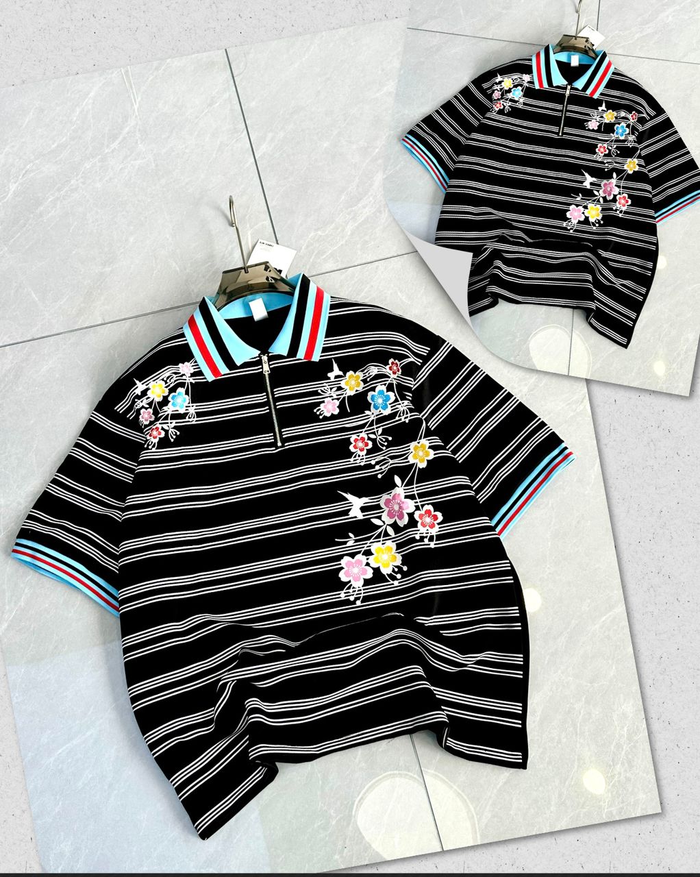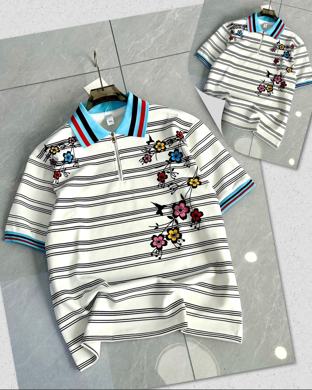 Elevate your casual style with this Floral Stripe Zip Polo, a perfect fusion of classic design and modern luxury. Crafted with sleek horizontal stripes on a deep black base, this shirt is enhanced by vibrant embroidered floral patterns that add a unique artistic touch.