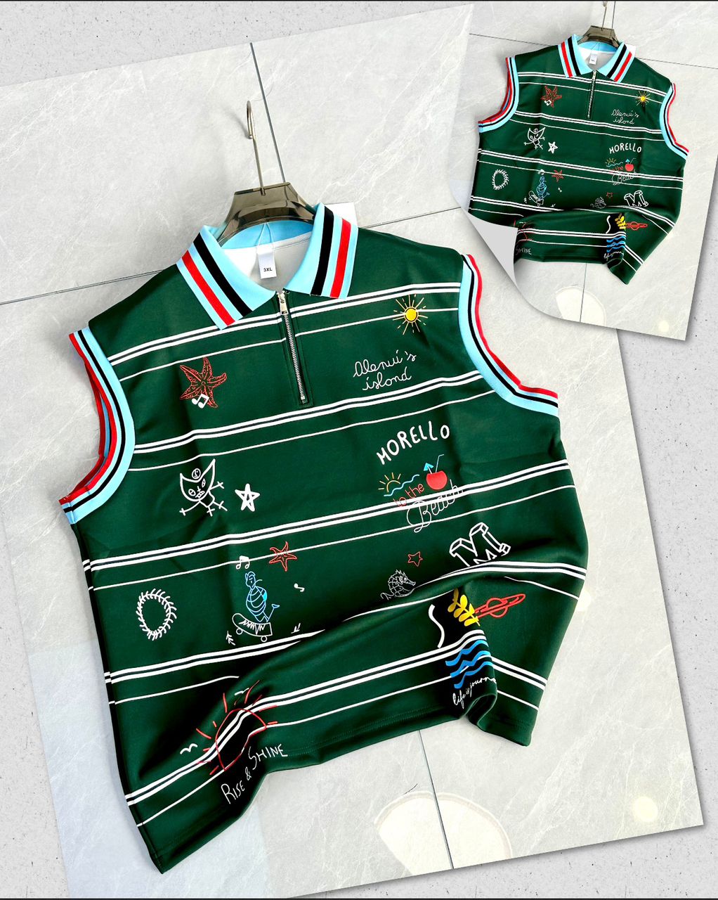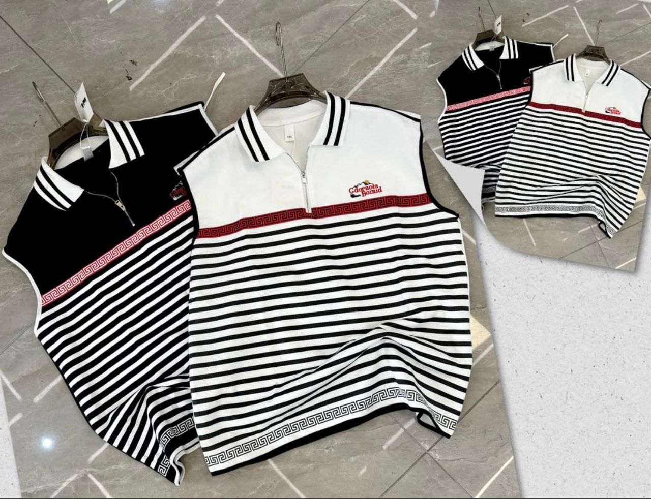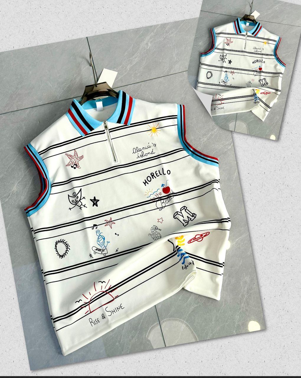 sleeveless zip polo top, designed for those who love standout fashion. Crafted in a deep black base, it features clean horizontal stripes and playful artistic doodle prints that add a creative edge.