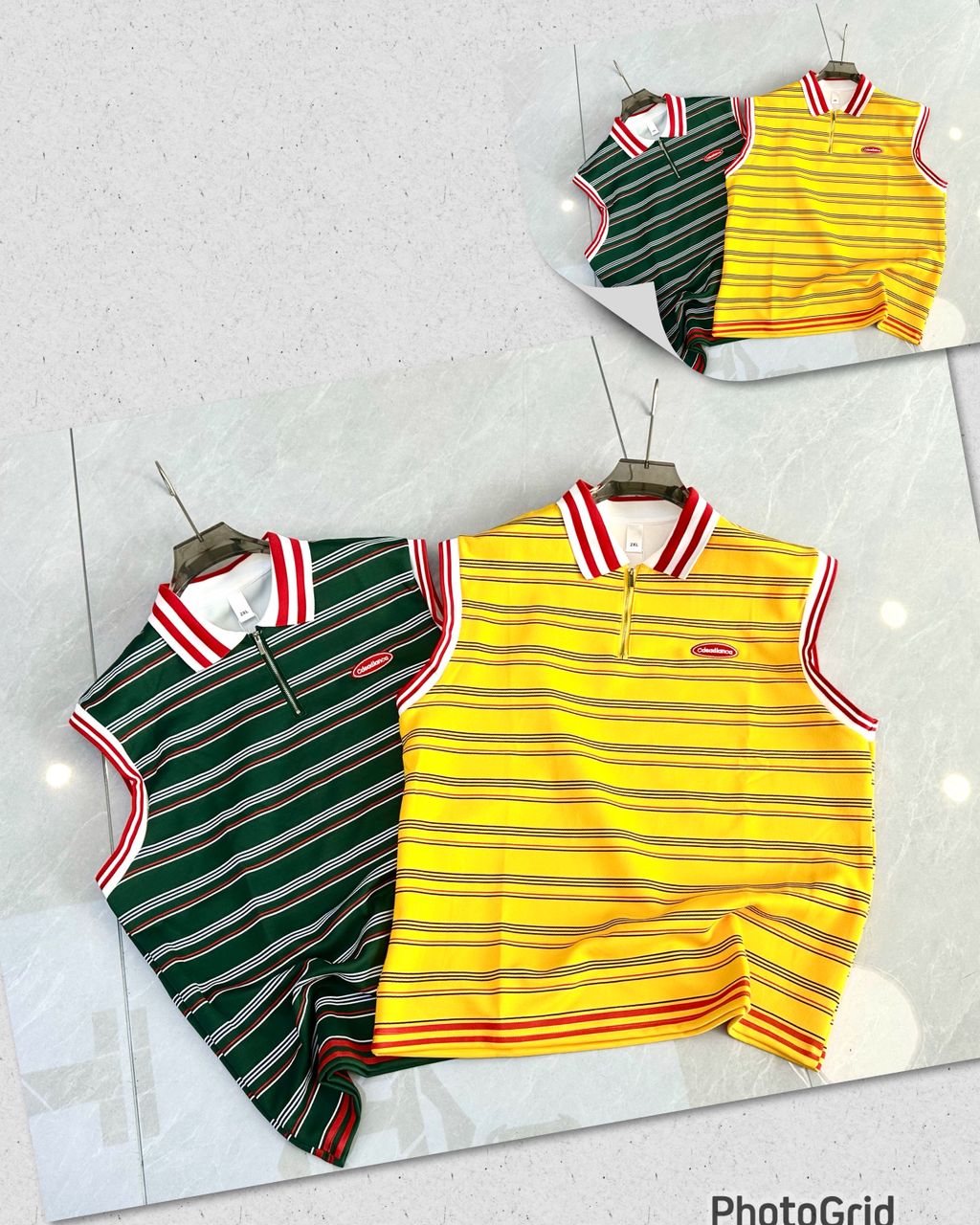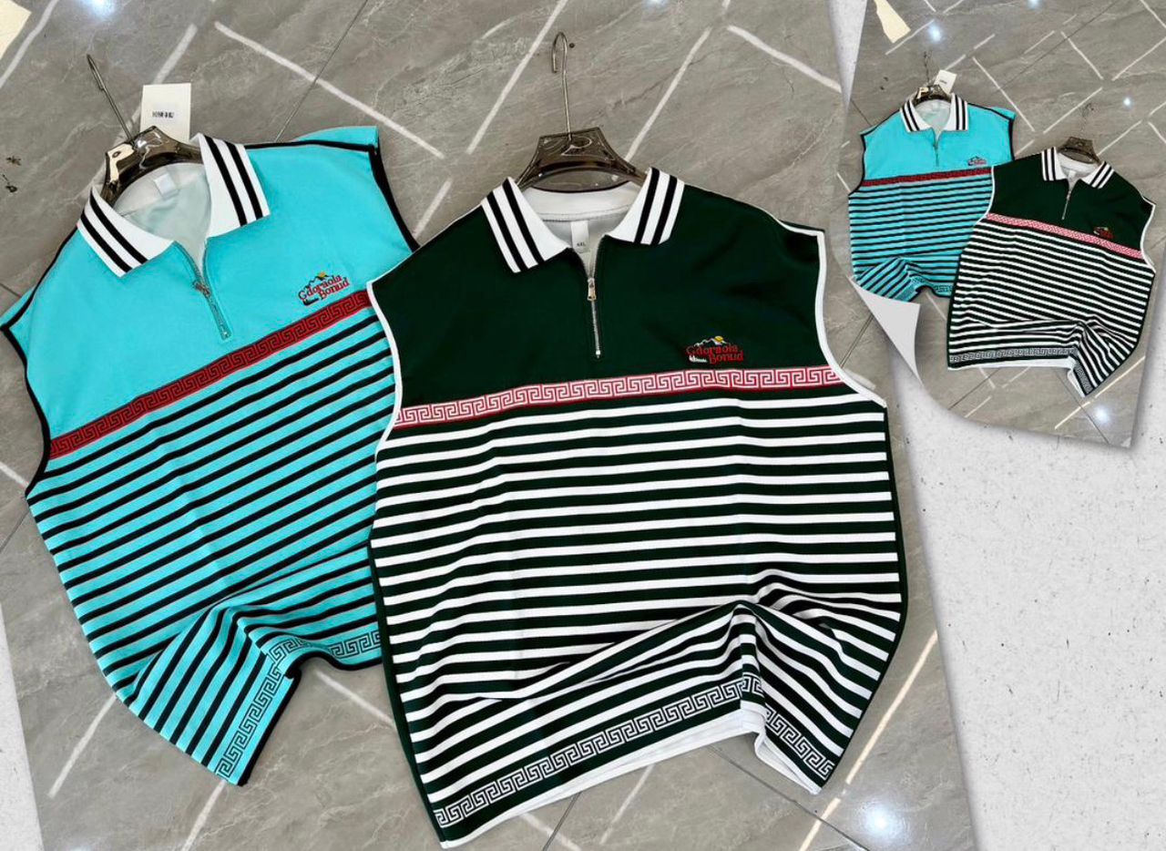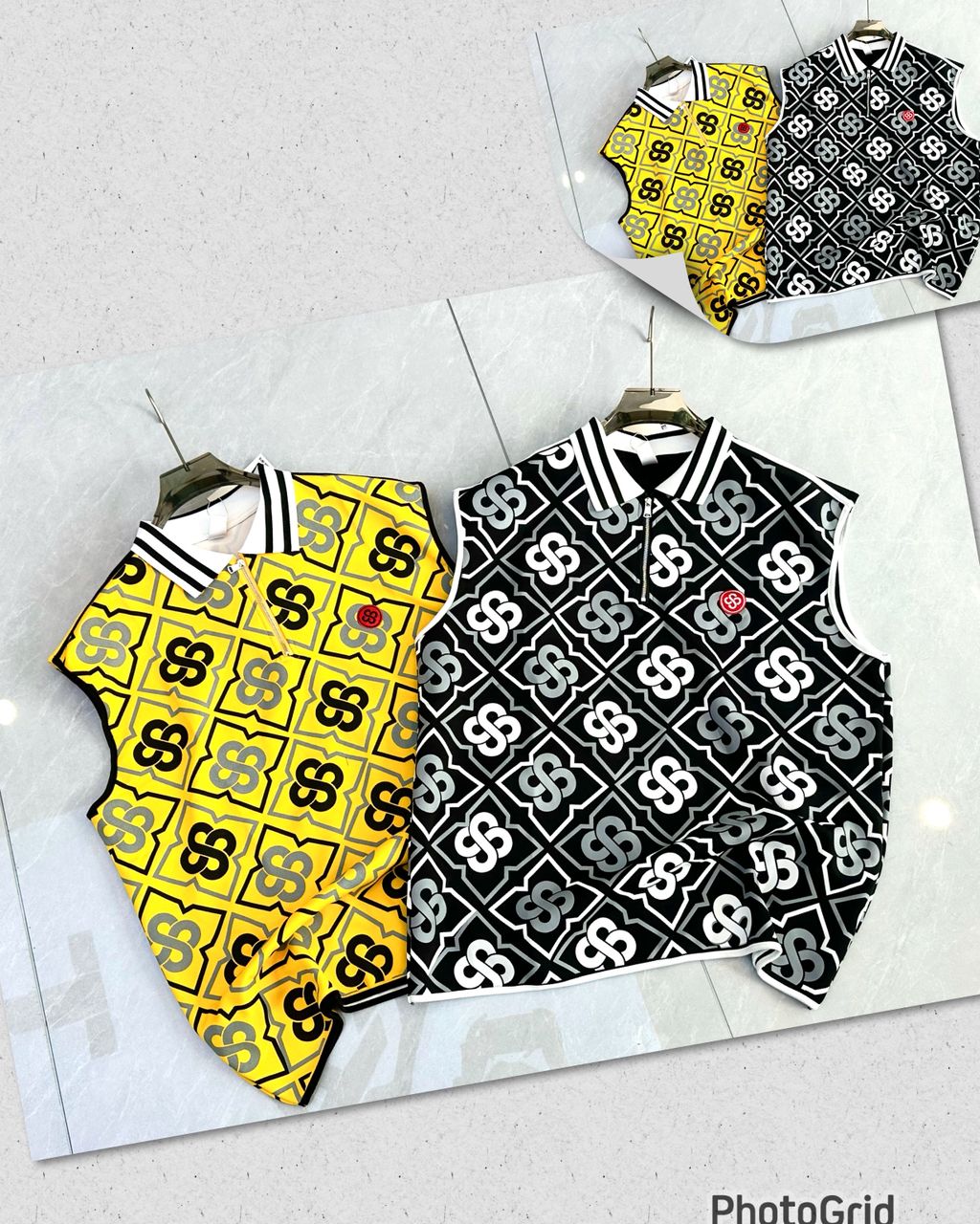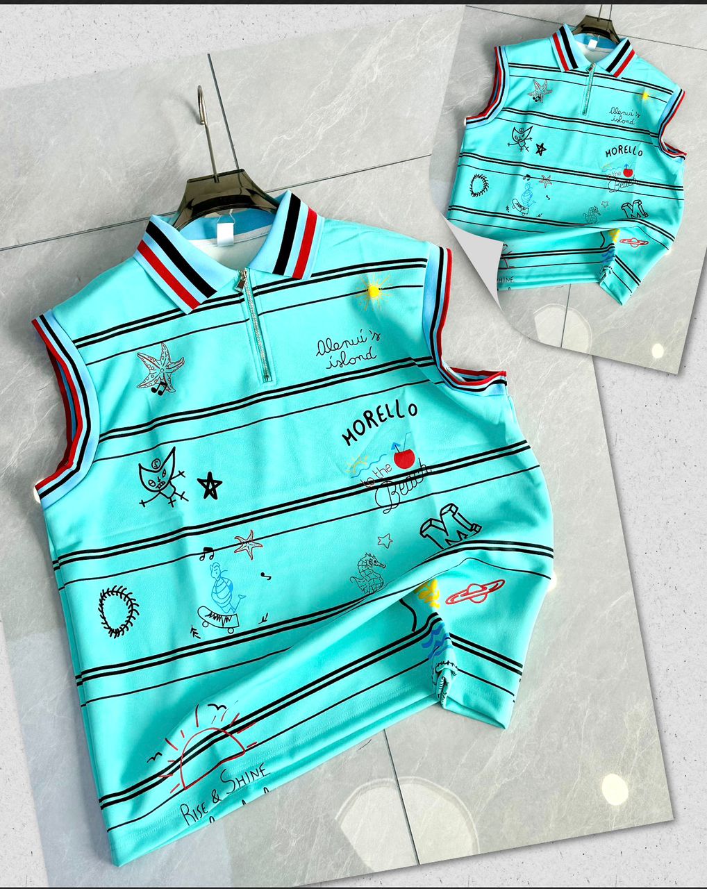 sleeveless zip polo top, designed for those who love standout fashion. Crafted in a deep black base, it features clean horizontal stripes and playful artistic doodle prints that add a creative edge.