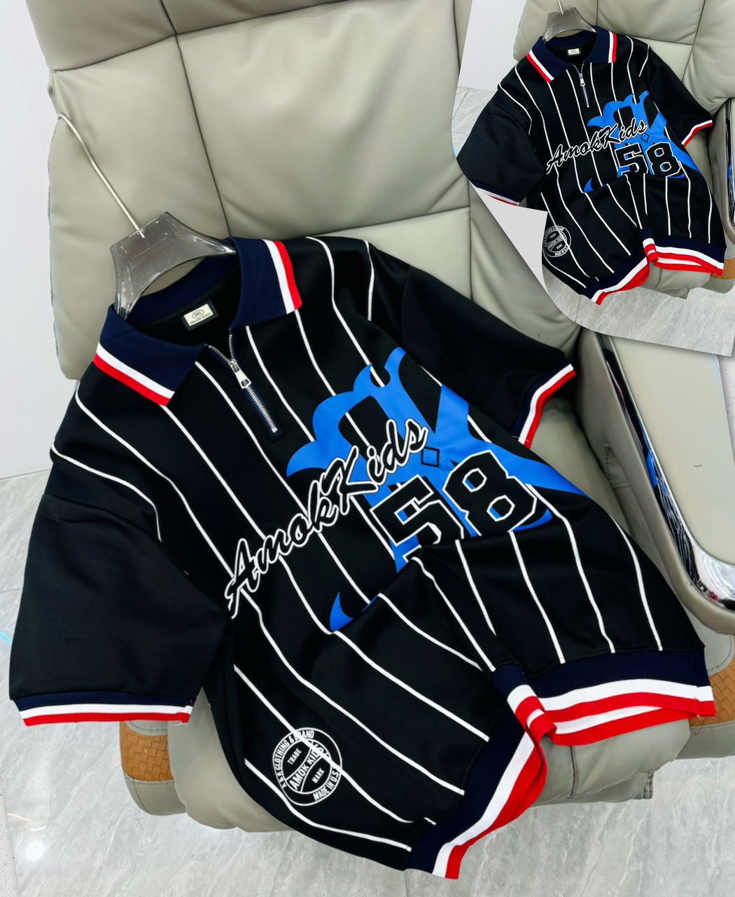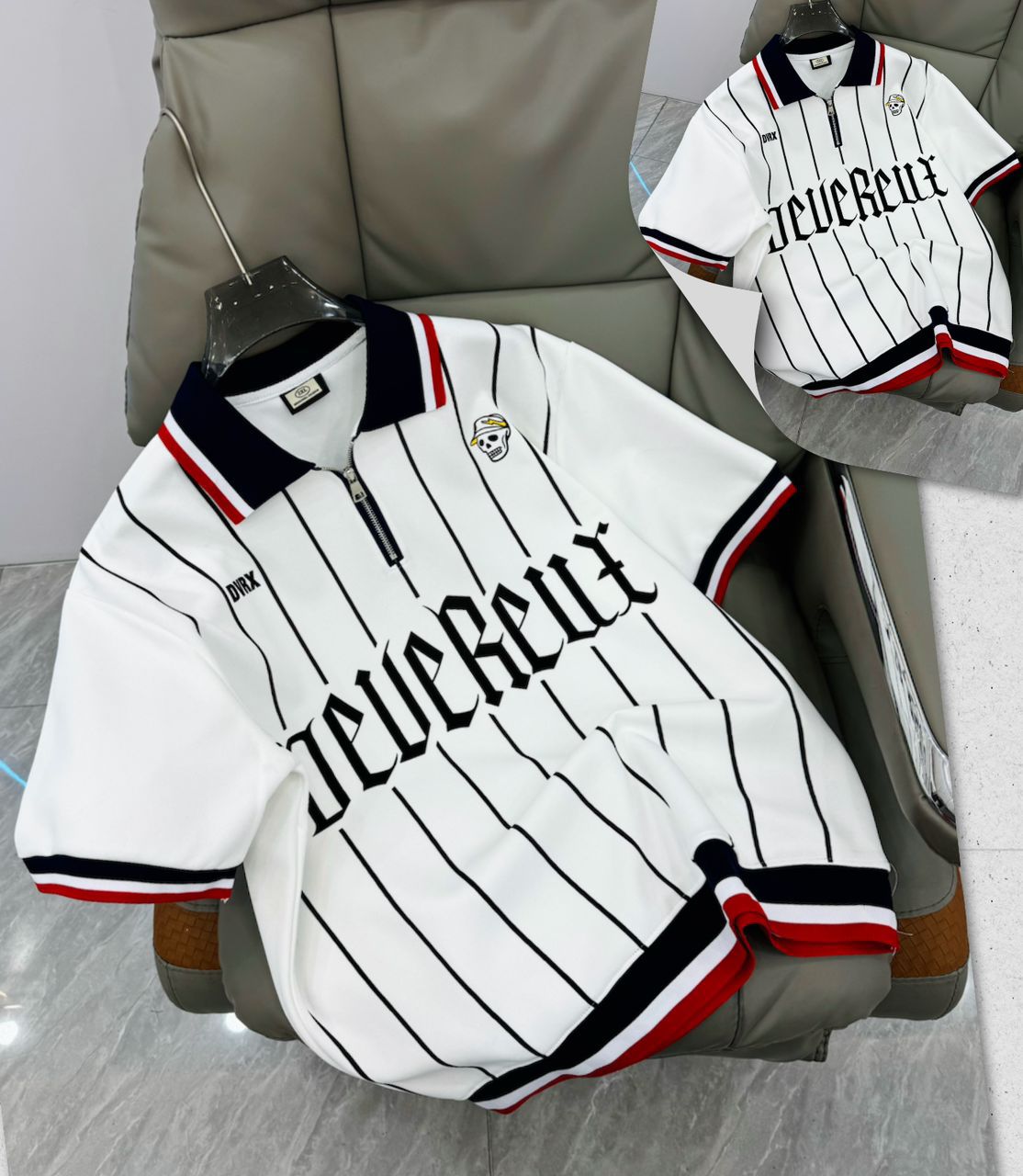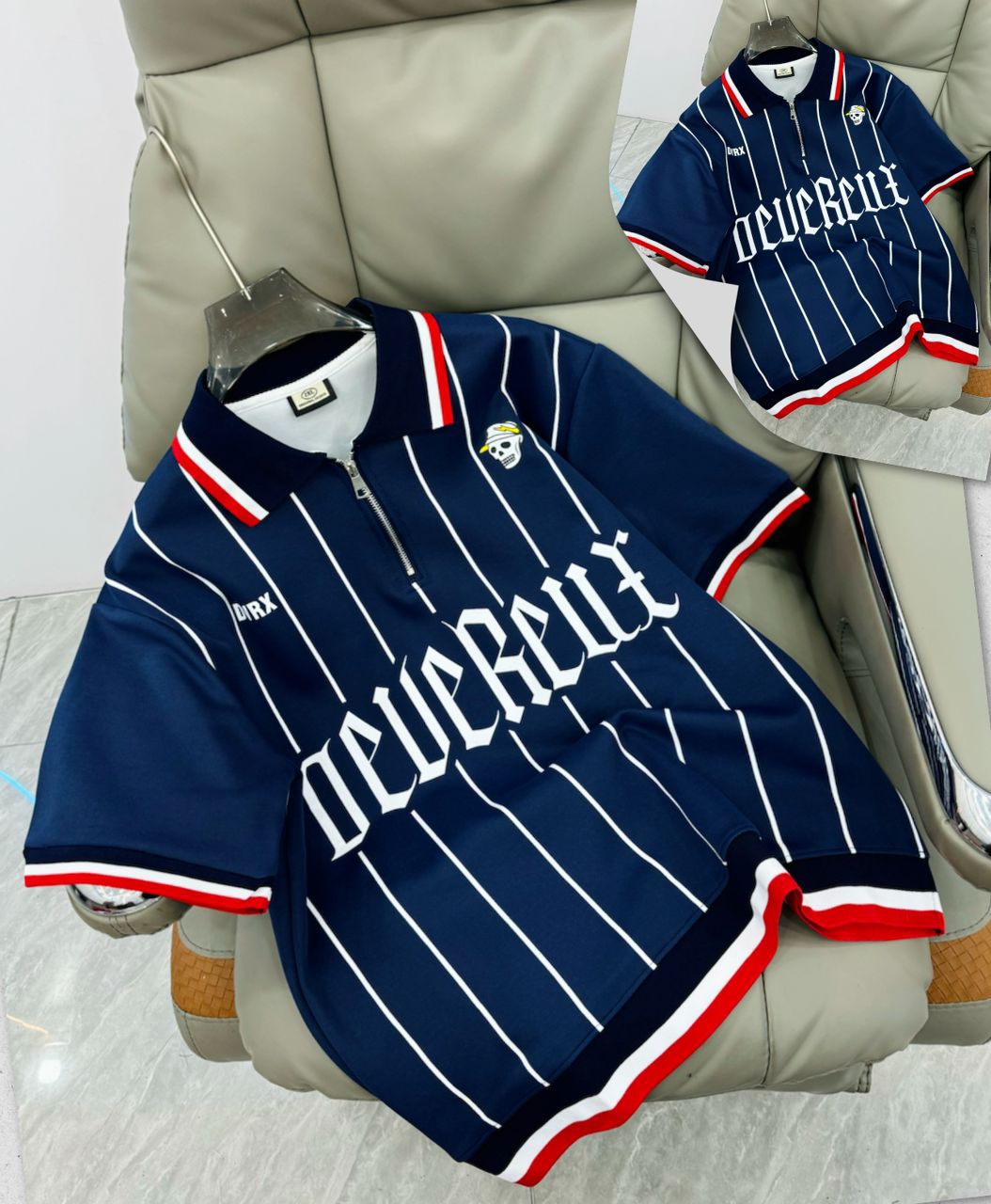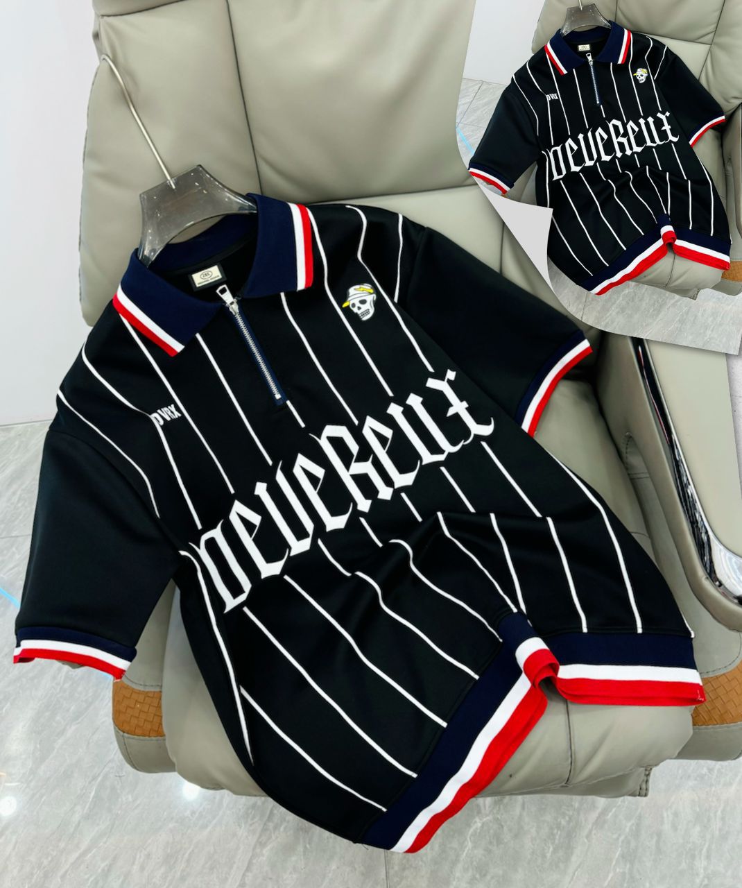 Make a bold statement with this premium red pinstripe zip polo shirt, crafted for confidence and standout style. The vibrant red base is enhanced with sleek black vertical stripes, giving it a sharp, modern silhouette.