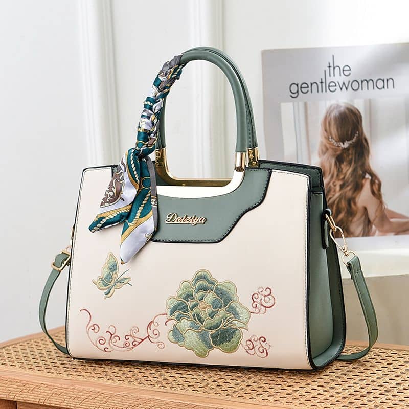 Discover timeless elegance with the Aurelia Belle Signature Tote, a refined blend of artistry and sophistication. Crafted from premium leather, this handbag features exquisite floral embroidery and delicate butterfly accents that symbolize grace and beauty. The structured silhouette is enhanced with polished gold-tone hardware and a silk scarf-wrapped handle for a touch of charm. Designed for both style and function, it offers a spacious interior and versatile carry options. Available in six stunning colors, it’s the perfect statement piece for modern, elegant women.