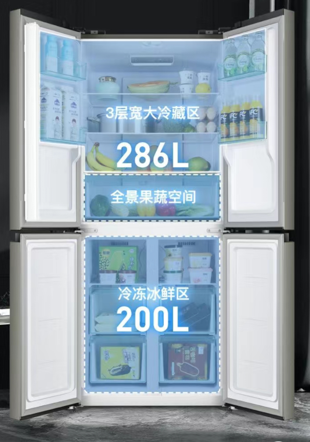 Its intelligent four-door design offers effortless organization, allowing you to separate fresh foods, beverages, and frozen items with ease. With a spacious 486-liter capacity, you get ample room for family storage without compromising style or space.