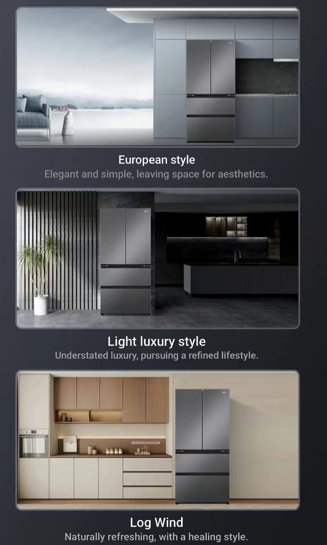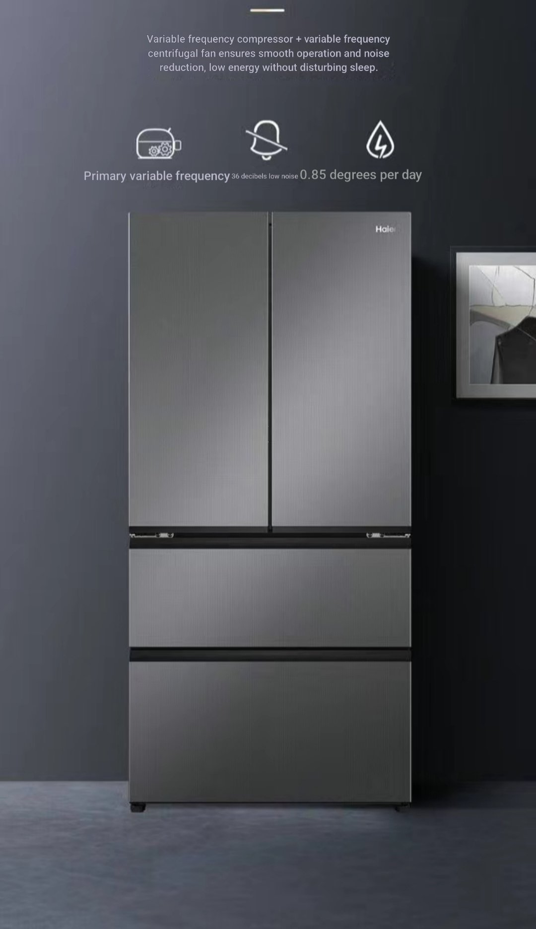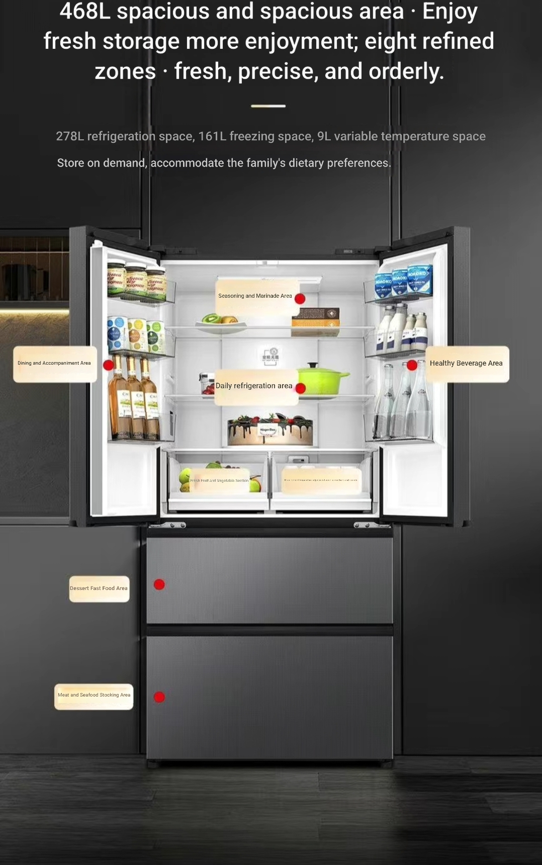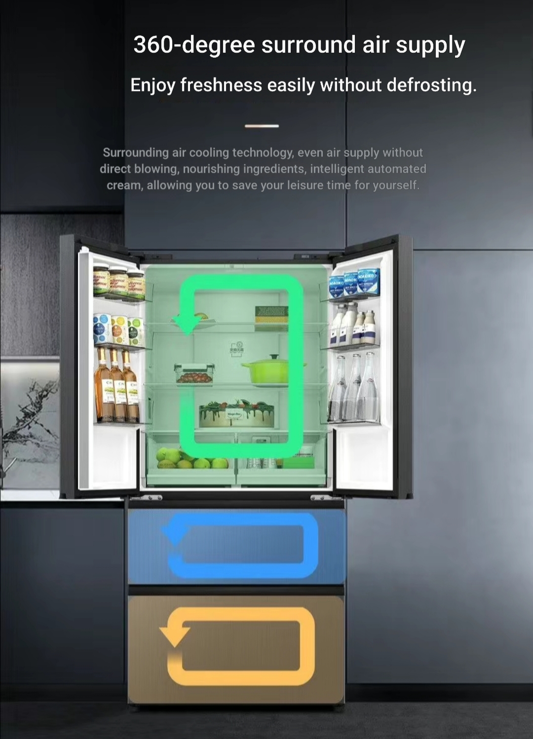 Its intelligent multi-door design features well-organized compartments, allowing you to store different food categories with ease — from beverages and fresh produce to meats and frozen items. The inverter technology ensures low energy consumption and quiet operation, while the frost-free air cooling system keeps your food fresh without ice build-up.