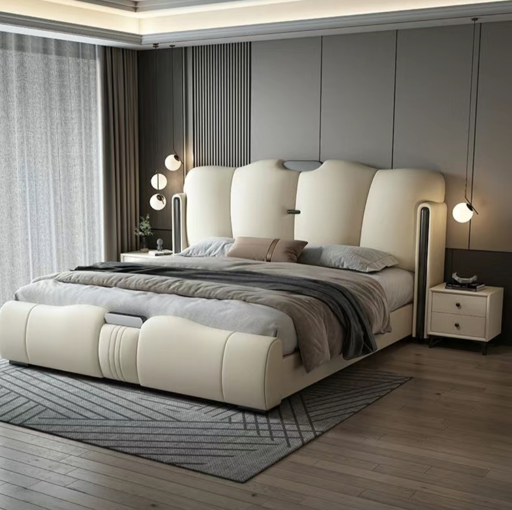 Experience the perfect blend of modern sophistication and functional luxury with this Italian-inspired king-size bed. Designed for those who appreciate elegance and comfort, this masterpiece features a sculpted upholstered headboard wrapped in premium genuine leather, delivering a soft, inviting feel with a refined aesthetic.