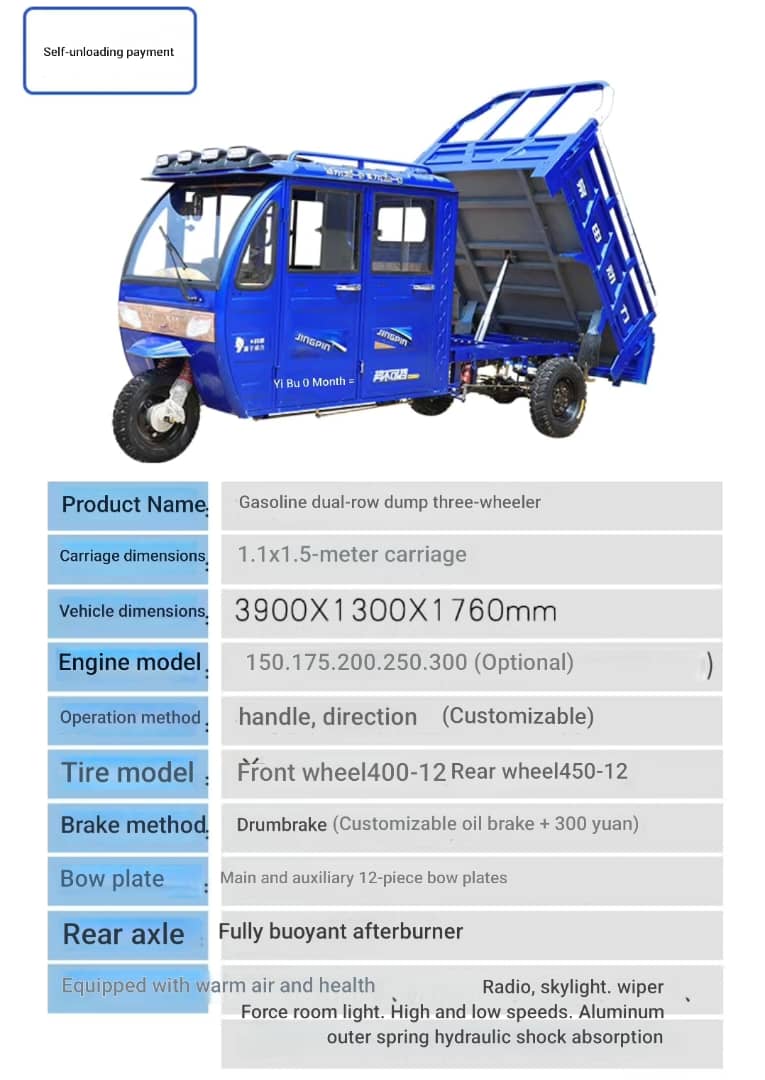 Equipped with a powerful 250cc engine, it delivers excellent strength for carrying heavy loads with ease, making it perfect for construction, farming, logistics, and daily commercial use. Its rugged tires, reinforced steel body, and high ground clearance ensure smooth movement even on rough and uneven roads.
